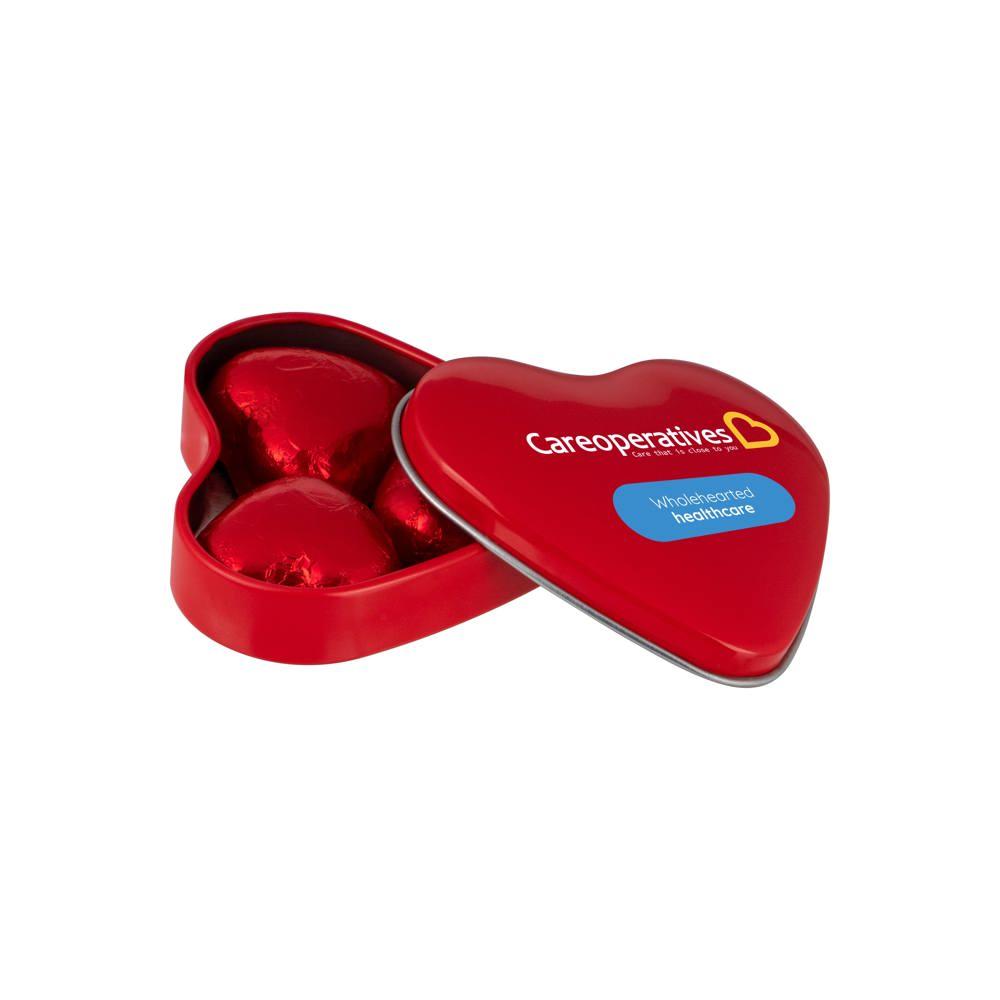 Hartenblikje wit met 3 chocolade hartjes in rood folie en voorzien van een full colour bedrukking. Inclusief ingrediëntensticker.