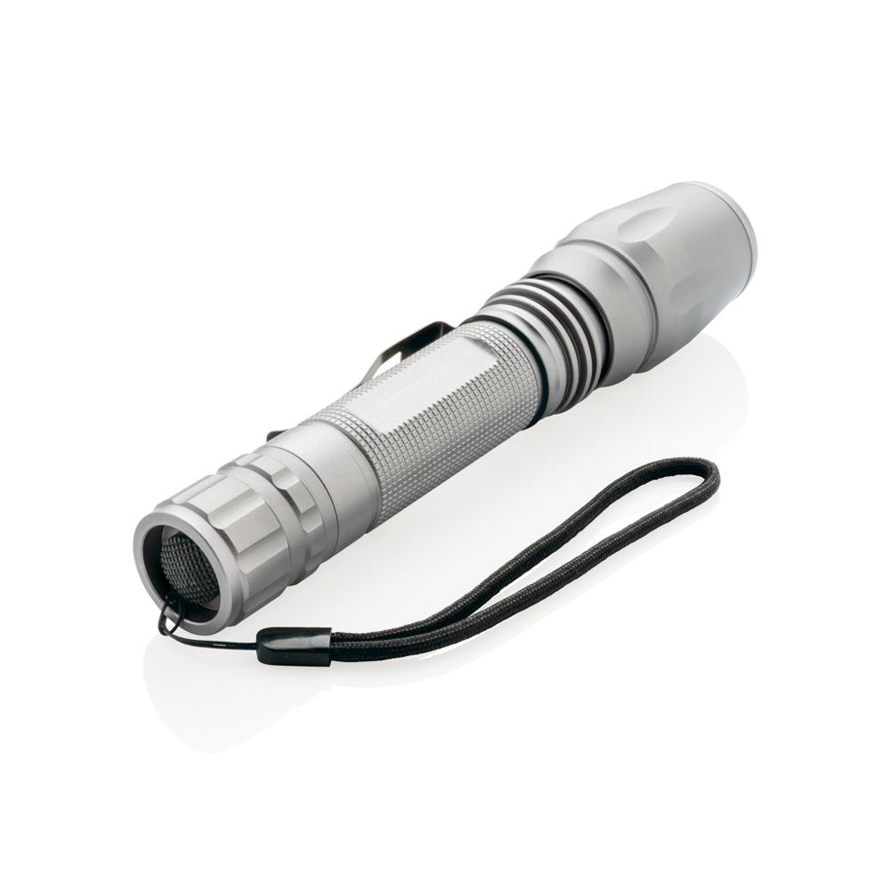 Ontdek deze superheldere 10W Cree LED-zaklamp met 250 lumen, ideaal als gepersonaliseerd relatiegeschenk. Je brandt ermee door de donkerste nachten dankzij de aanpasbare lichtbundel: focus voor precisie of breed voor overzicht.