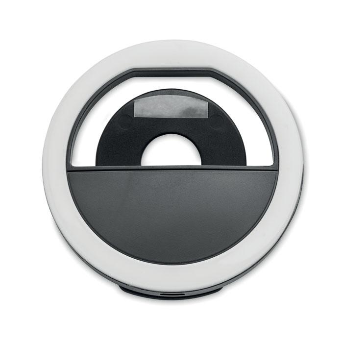 Draagbare selfie ringlamp van ABS kunststof met 28 LED's. Wit licht in 3 licht sterkten. Met een 80 mAh USB oplaadbare batterij. Formaat Ø 8cm.