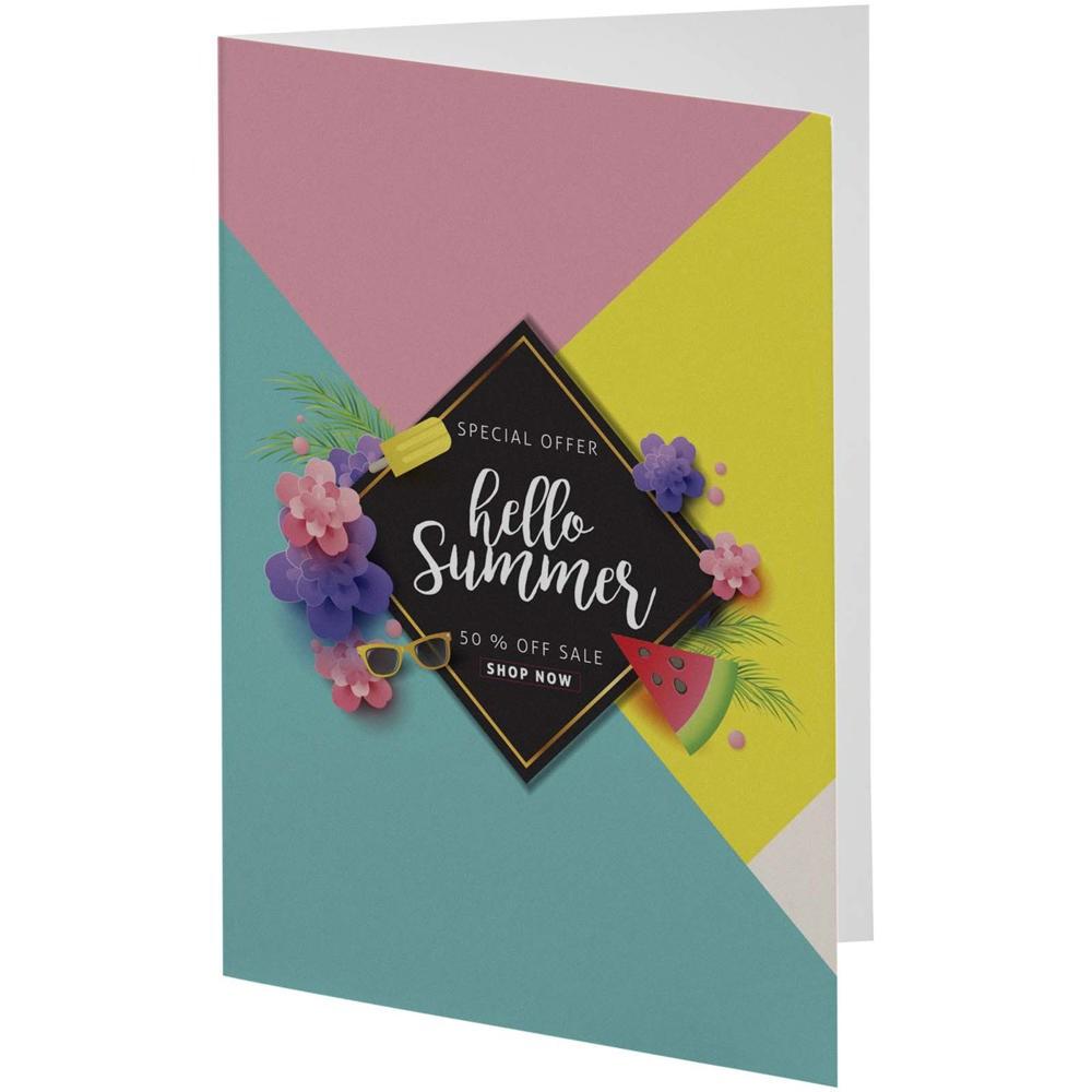 Maak indruk op je klanten met deze premium a6 wenskaart van stevig 320 g/m² karton. Je bedrukt hem volledig naar wens, zowel buiten- als binnenkant, met je logo of eigen ontwerp. Kies voor hotstampfolie of reliëfdruk en geef je kaart een luxueuze touch die je merk versterkt.