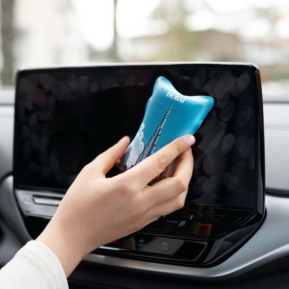 In de auto, thuis of onderweg - de displayspons valt vooral op door zijn design en de kleurintensieve bedrukking op hoogwaardig, veganistisch kunstleer.