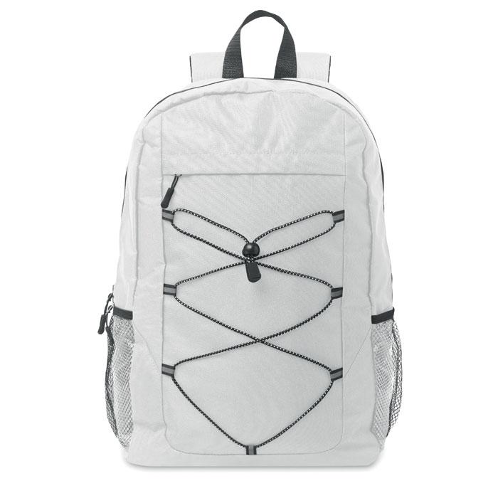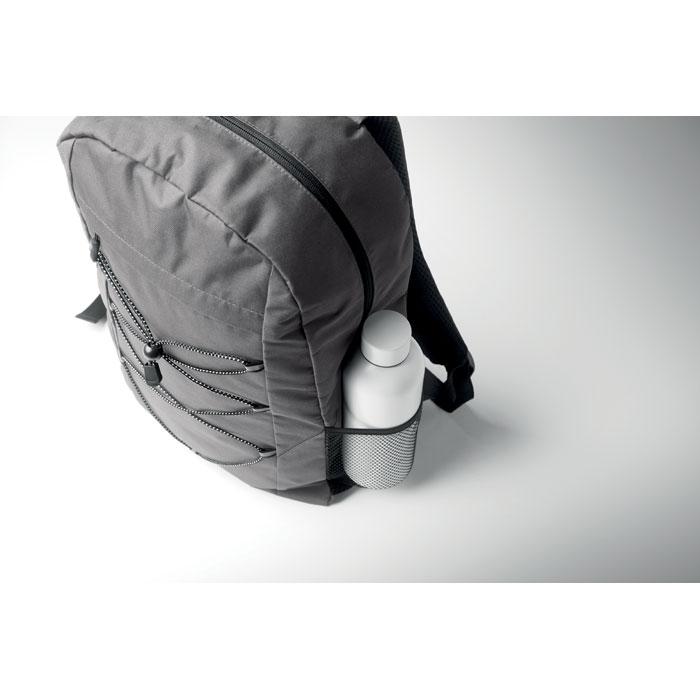Rugzak van 600D RPET polyester met decoratief koord en ritsvak aan de voorkant. Meshzakken aan beide kanten.