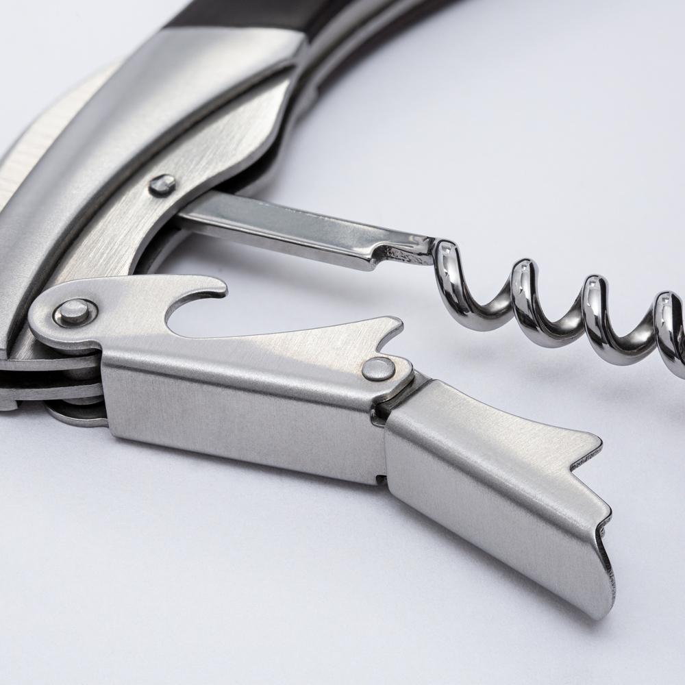 Je maakt indruk met het Hoogwaardig Kelnermes RE98-CORXX als gepersonaliseerd relatiegeschenk voor jouw events en promoties. Dit premium 3-in-1 tool van gerecycled roestvrij staal met stevig houten handvat biedt een kurkentrekker, flesopener en foliesnijder met gekartelde rand. Dankzij het tweestaps hefboomsysteem haal je moeiteloos elke kurk eruit, ideaal voor sommeliers en horeca.