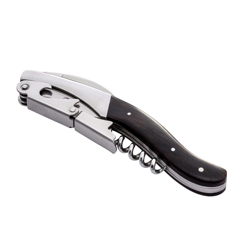 Ontdek dit premium kelnersmes van gerecycled roestvrij staal met stevig houten handvat. Je combineert drie essentiële tools in één compact ontwerp: kurkentrekker, flesopener en foliesnijder met gekartelde rand. Dankzij het tweestaps hefboomsysteem verwijder je elke kurk soepel en moeiteloos, perfect voor events en horeca. Alles klapt naadloos in voor handig meenemen.