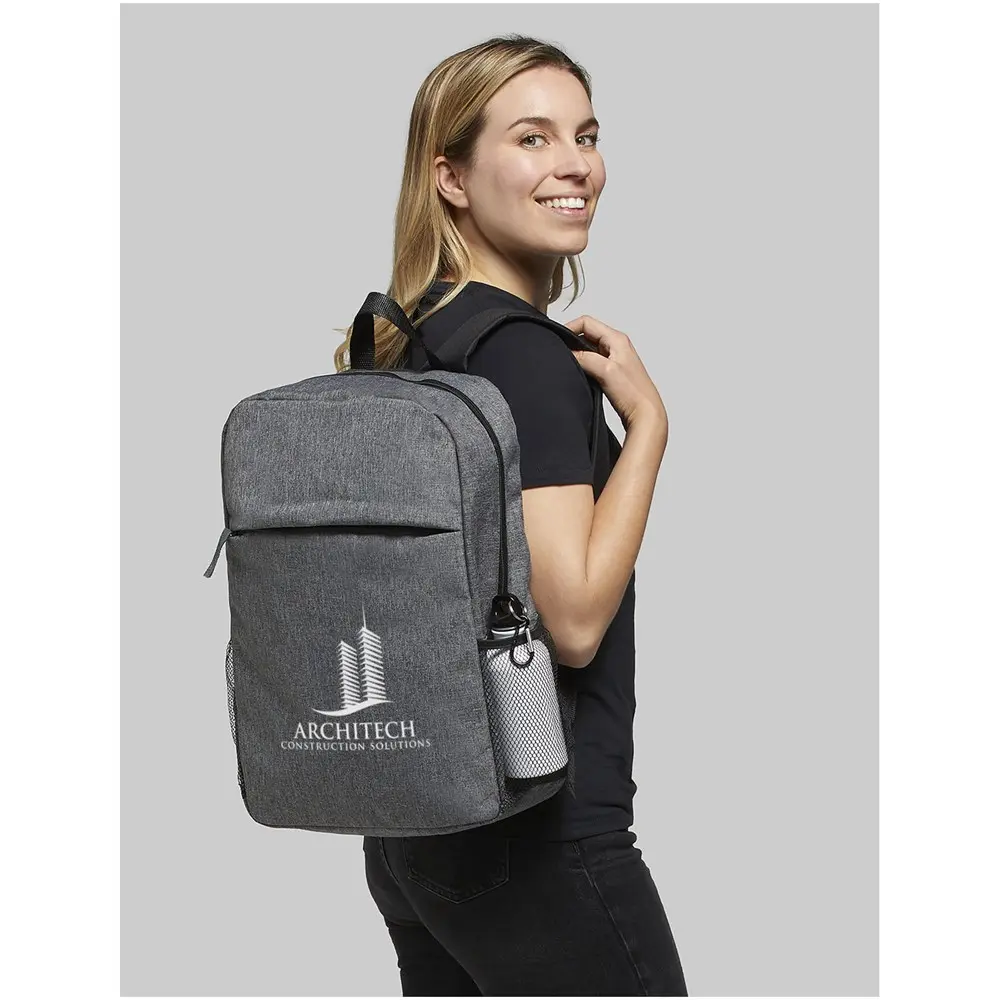 De Hoss 15" laptop rugzak met 18L capaciteit biedt uw bedrijf een ideaal relatiegeschenk voor marketingacties en events. Dit functionele model uit 300D polyester (maat 32 x 43 x 14 cm) beschikt over een ruim hoofdcompartiment met ritssluiting, perfect voor een 15" laptophoes. Het voorvak met ritssluiting geeft snelle toegang tot mobiele apparaten, ideaal voor professionals onderweg.