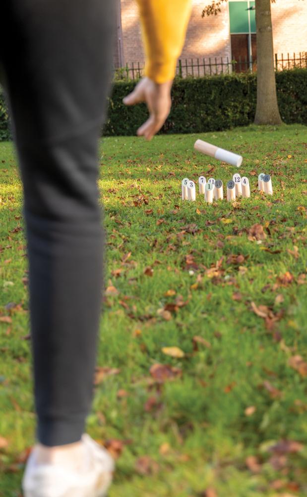 Dit verslavende tactische spel daagt spelers uit om de houten cilinder onderhands naar de 12 houten pinnen te gooien. De eerste speler die precies 50 punten bereikt, wint. Het mag niet hoger zijn dan 50. Het lijkt misschien gemakkelijk, maar het is een grote uitdaging! Na elke worp worden de pinnen weer rechtop gezet. De set bevat: 12x genummerde pinnen en 1 houten werper allemaal gemaakt van sterk grenenhout. Inclusief katoenen zakje en spelregels
