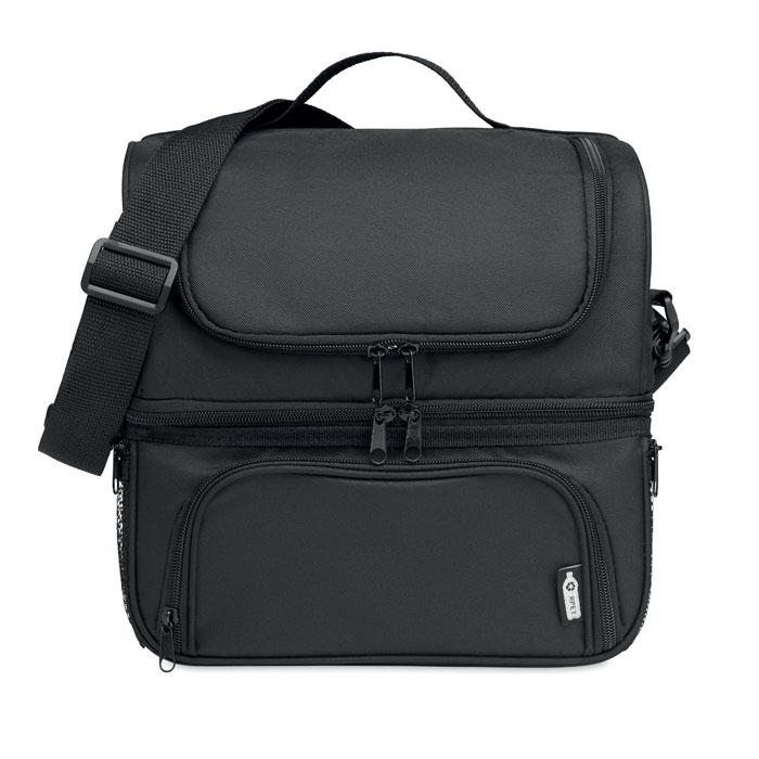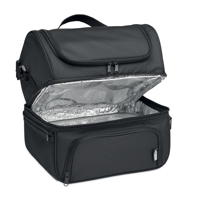 Geïsoleerde koeltas van 600D RPET met een herbruikbare lunchbox van PP kunststof, 1900 ml inhoud. Met 2 compartimenten om koud en warm voedsel gescheiden te houden. Met afneembare en verstelbare schouderband. Gevoerd met 2mm aluminium folie.