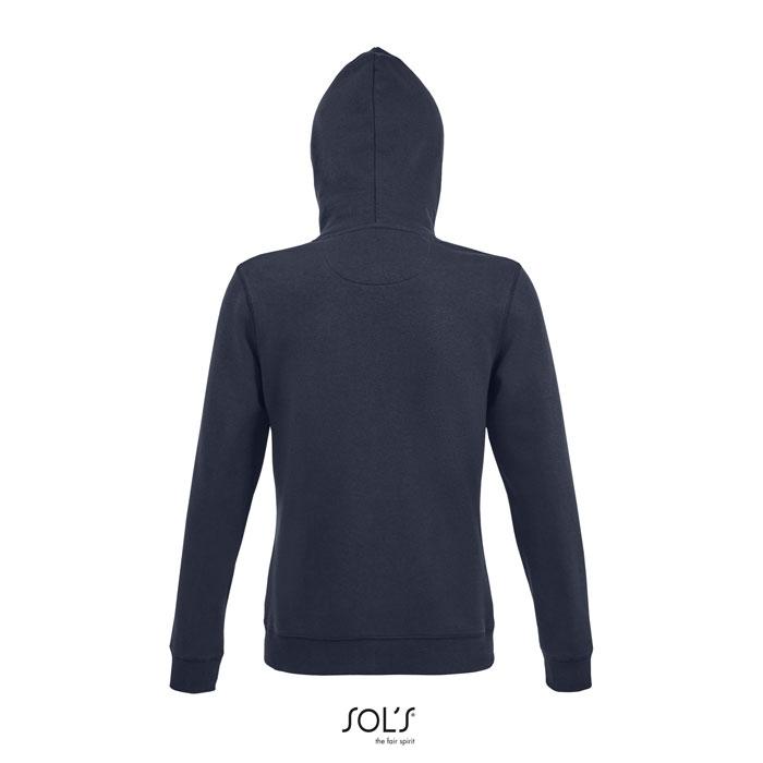 SOL'S SPIKE WOMEN. Hoodie met rits voor dames, 80% ringgesponnen katoen - 20% polyester geborstelde voering. Buitenkant: 100% katoen FLEECE 280 LSF (Low Shrinkage Fabric), ingezette mouwen, 2 buidelzakken voor, gesneden en gestikt, gevoerde capuchon met ton-sur-ton trekkoord, 2x2 geribde manchetten en zoom. Halve maan binnenkraag, getapete nek, YKK ritssluiting. OEKO-TEX®. Uitsluitend verkocht met opdruk.