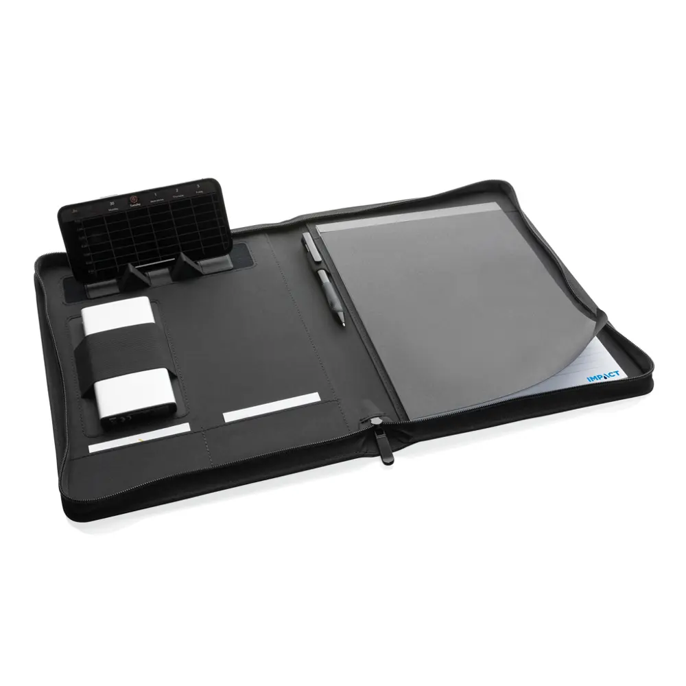 Ontdek de A4 Impact AWARE™ deluxe 300D tech portfolio met ritssluiting, ideaal voor uw professionele uitstraling tijdens events en meetings. Dit praktische accessoire houdt uw documenten, notities en visitekaartjes netjes georganiseerd, terwijl het ruimte biedt voor uw smartphone en pen. Met een ingebouwd gelinieerd schrijfblok op gerecycled papier van 70 g/m² en 20 pagina's ondersteunt het uw productiviteit op een duurzame wijze.