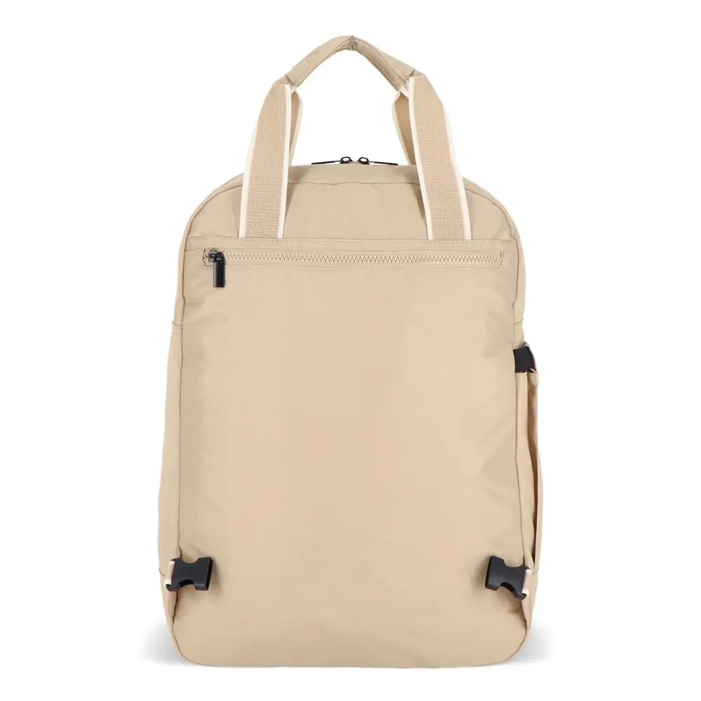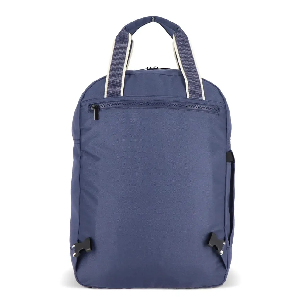 Praktische details maken hem onmisbaar: een rekbaar zijvak voor flessen of paraplu's, en stevige ritsen voor snelle toegang. Transformeer de rugzak moeiteloos in een draagtas via de schouderhengsels in het achtervak. Met deze functionaliteit versterkt u uw merk bij klanten en relaties, terwijl u duurzaamheid en gebruiksgemak promoot. Perfect voor bulkbestellingen met personalisatie.