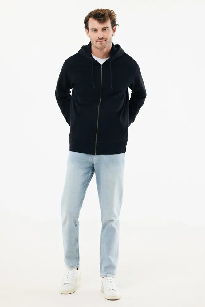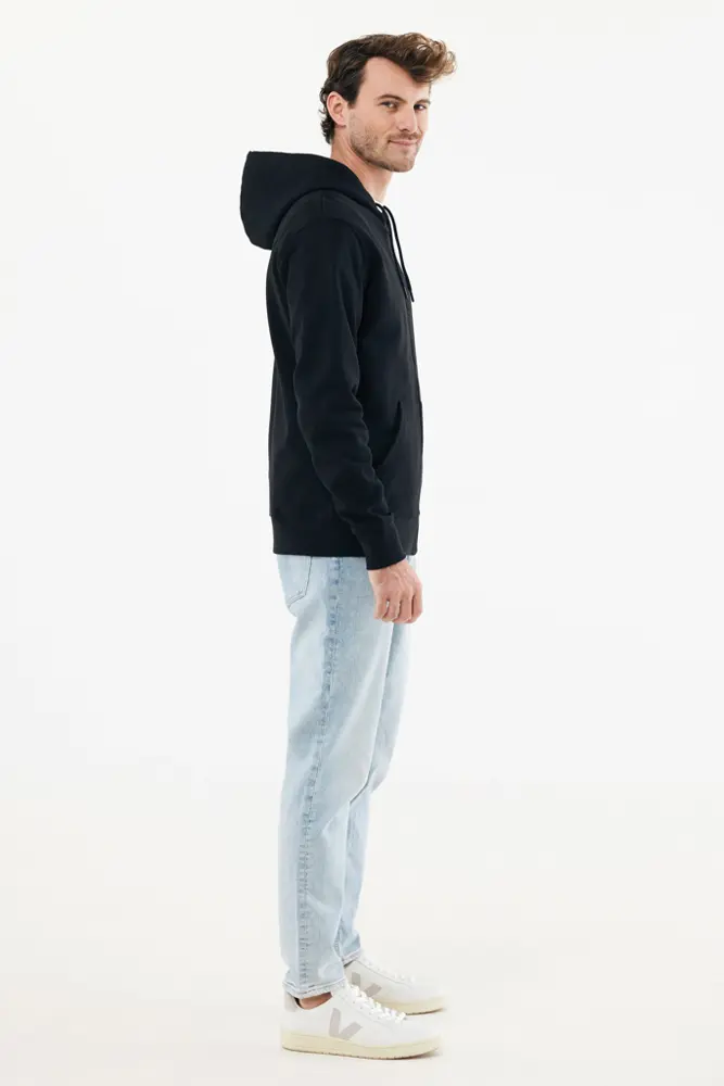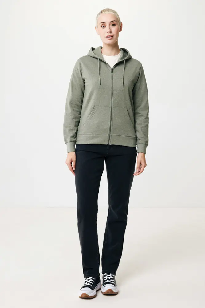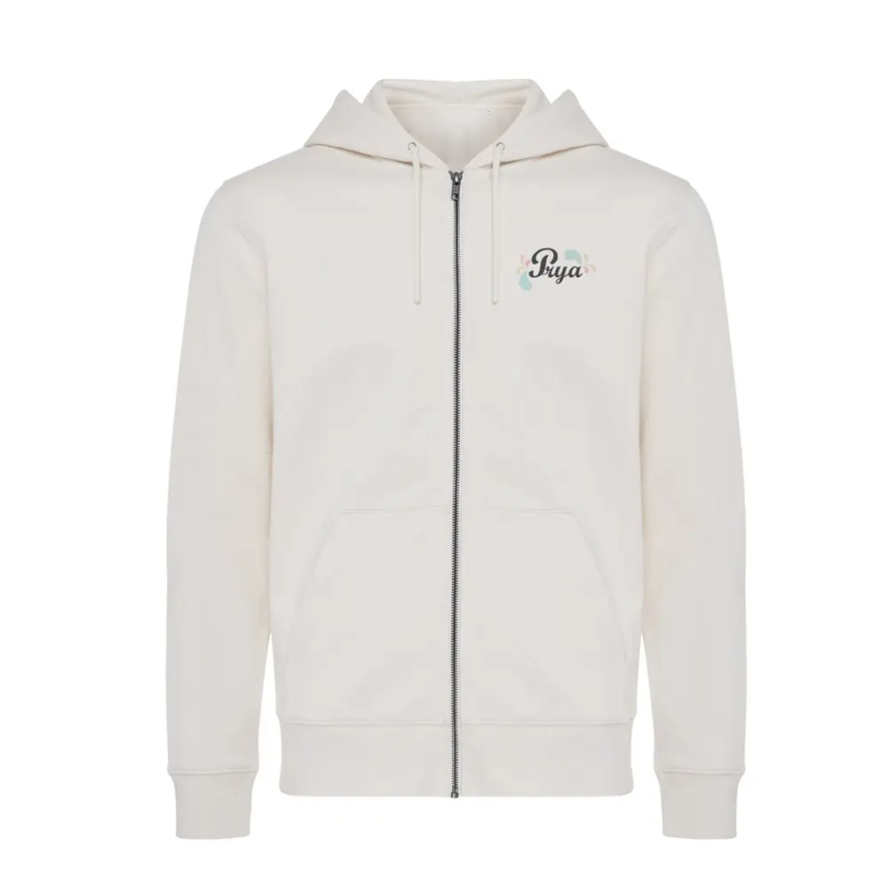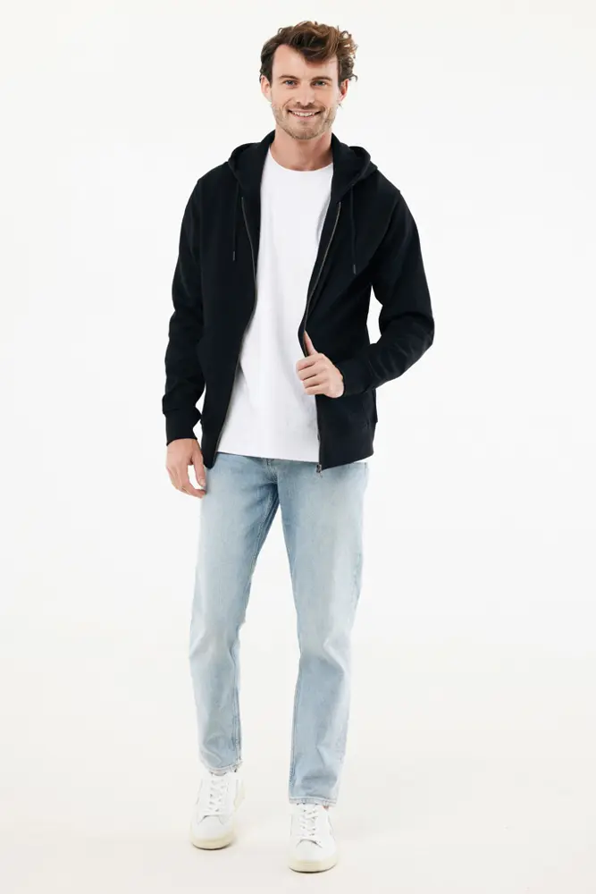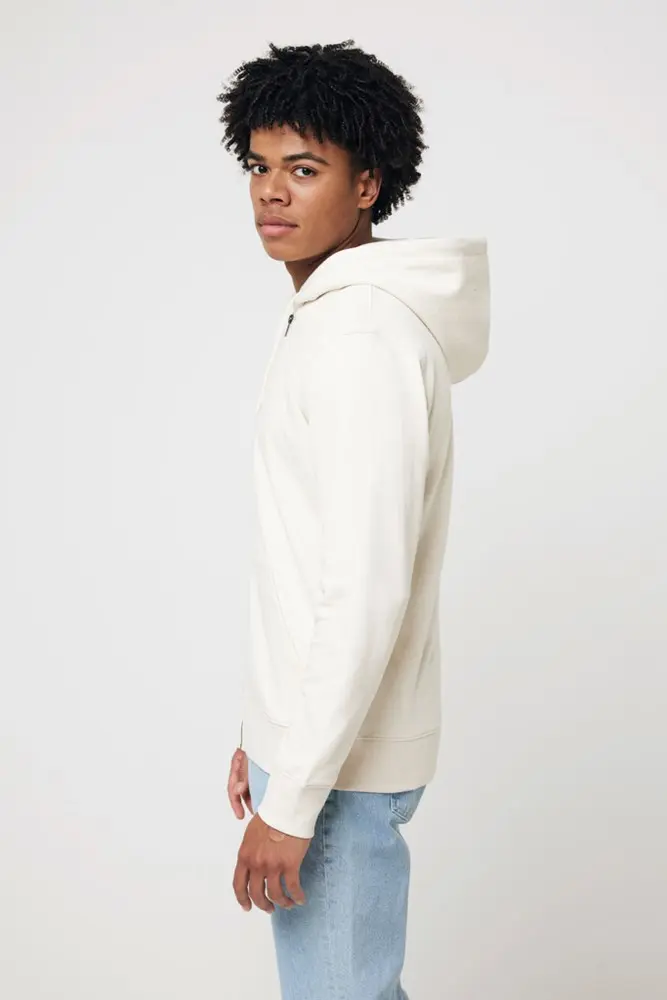 Ontdek deze uniseks hoodie met rits en moderne pasvorm, ideaal als gepersonaliseerd relatiegeschenk. Gemaakt van 100% katoen, met 50% gerecycled en 50% biologisch materiaal, biedt het een zacht en comfortabel draaggevoel. Het gewicht van 340 g/m² zorgt voor een stevige kwaliteit die lang meegaat. Met een dubbellaagse capuchon, lange mouwen en 1x1 ribboorden past het perfect bij uw branding op events of als reclame-uitgift.