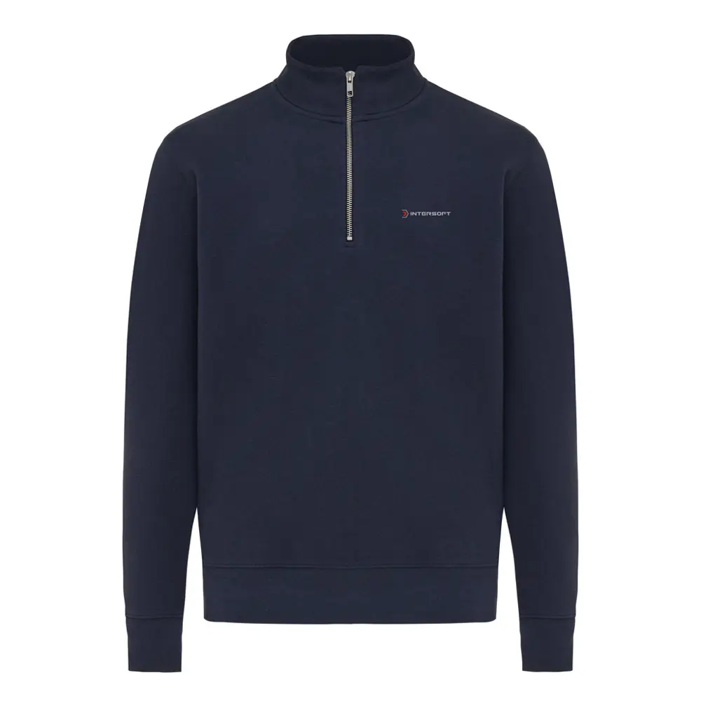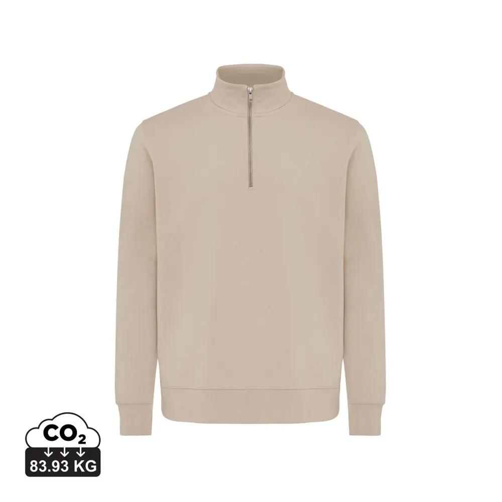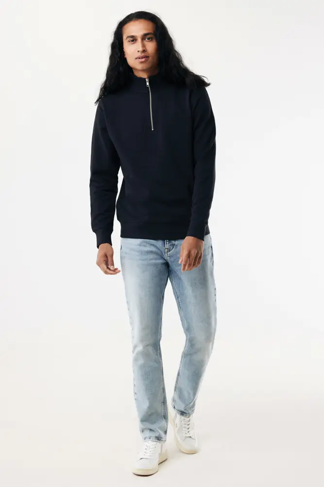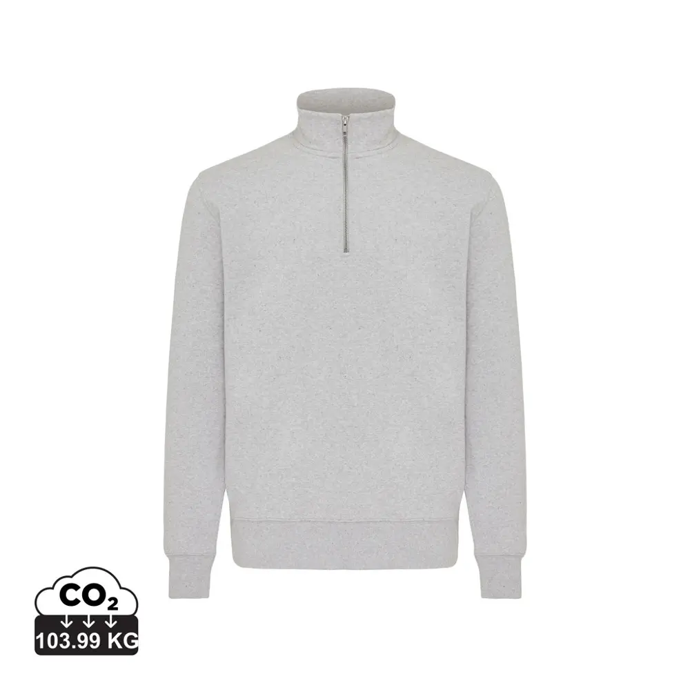 Ontdek de IQONIQ Elgon unisex sweater met kwartritssluiting, ideaal als gepersonaliseerd relatiegeschenk voor uw merk. Gemaakt van 100% katoen – 30% gerecycled en 70% biologisch – in een comfortabel 300 g/m² French terry, biedt deze sweater een moderne pasvorm met kraag van dezelfde stof, ingezette mouwen en ribboorden voor een eigentijdse look.