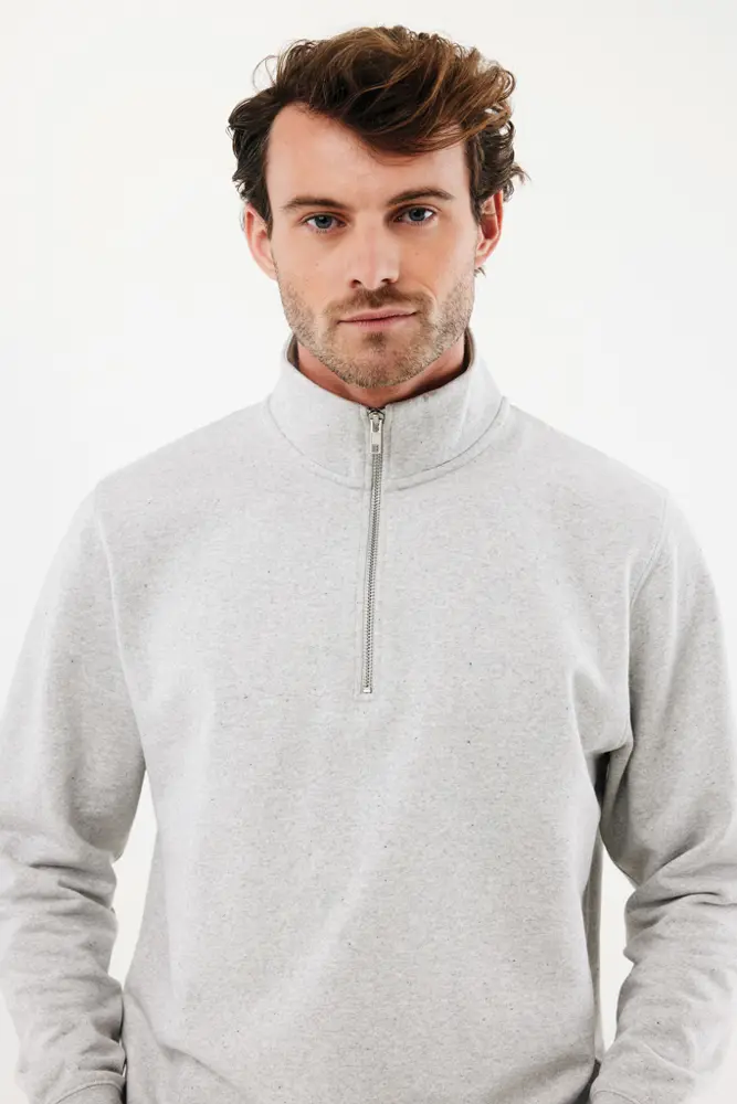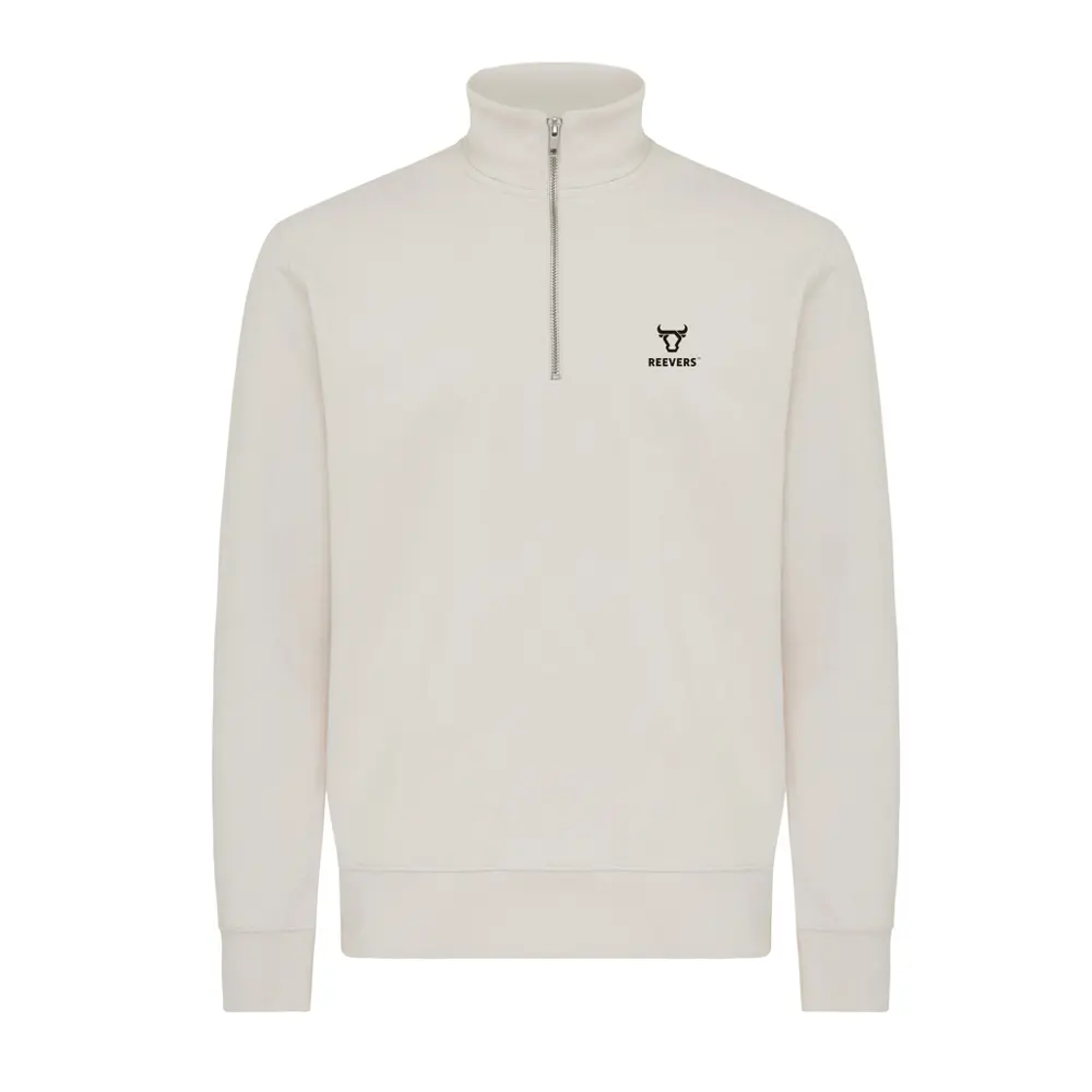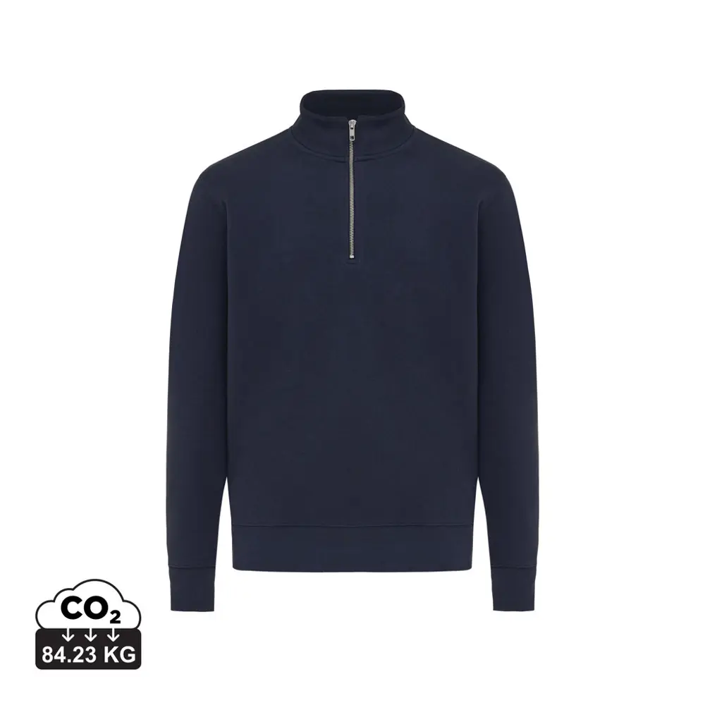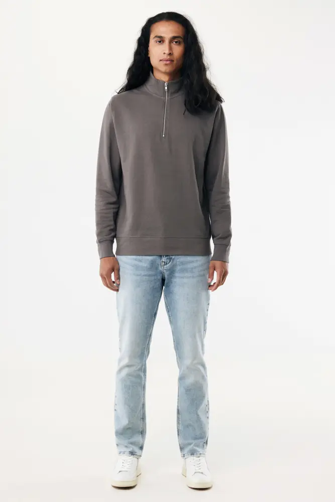 Ontdek de IQONIQ Elgon unisex sweater met kwartritssluiting, ideaal als gepersonaliseerd relatiegeschenk voor uw merk. Gemaakt van 100% katoen – 30% gerecycled en 70% biologisch – in een comfortabel 300 g/m² French terry, biedt deze sweater een moderne pasvorm met kraag van dezelfde stof, ingezette mouwen en ribboorden voor een eigentijdse look.