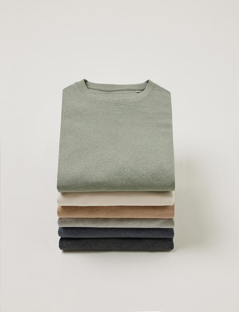 We mixen gerecycled katoen met biologisch katoen voor een natuurlijk gemêleerd effect, zonder verfproces. Zo minimaliseer je je ecologische voetafdruk en toon je duurzaamheid aan je klanten.