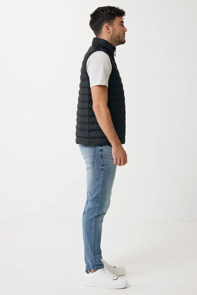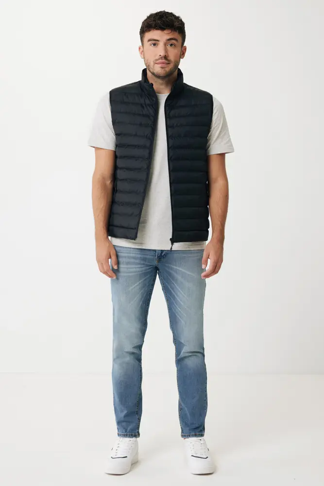 Ontdek de heren medium fit bodywarmer, ideaal als gepersonaliseerd relatiegeschenk met logobedrukking. Gemaakt van 100% gerecycled polyester met een volledig gewatteerde vulling van hetzelfde duurzame materiaal, biedt deze bodywarmer uw merk een professionele en milieubewuste uitstraling. De omgekeerde spiraalrits aan de voorkant en praktische ritszakken in de zijnaden zorgen voor gebruiksgemak en een verfijnde look, terwijl extra ritstrekkers en netjes afgewerkte naden de kwaliteit benadrukken. Armsgaten met bandelastiek garanderen een comfortabele pasvorm.