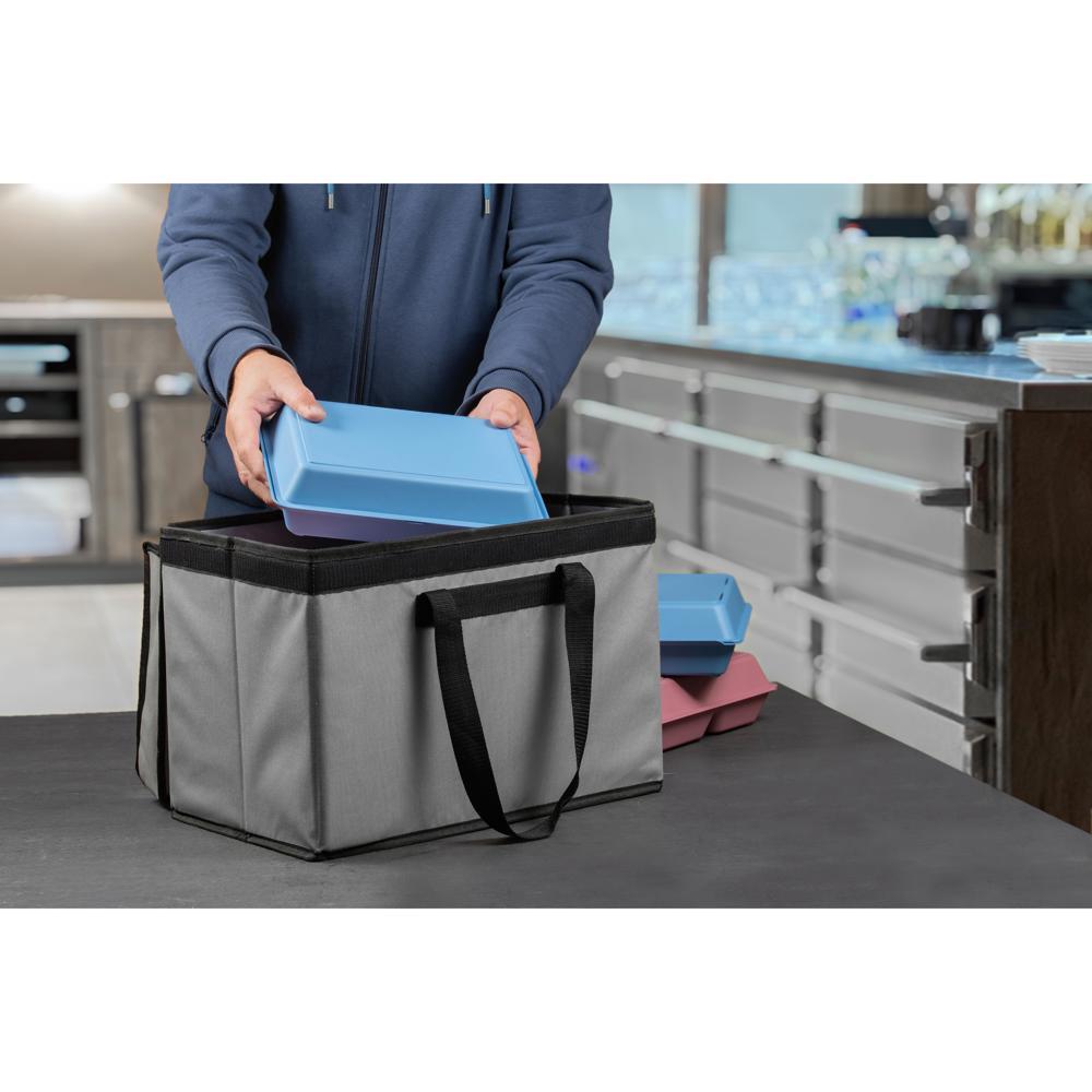 Deze stabiele tas met duurzame draaggreep past naadloos in de elastoREuse-reeks en biedt ruimte voor combinaties zoals 6 grote menuboxen (01743), 4 grote foodbowls (01965) of 4 menuboxen met 2 burgerboxen (01744). Je personaliseert hem eenvoudig met jouw logo, wat je merk versterkt als duurzaam en professioneel relatiegeschenk.