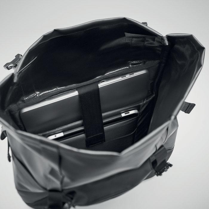Rolltop rugzak van 50C tarpaulin met gewatteerde rug, bodem en schouderbanden versteviging. Voorvakken met rits.