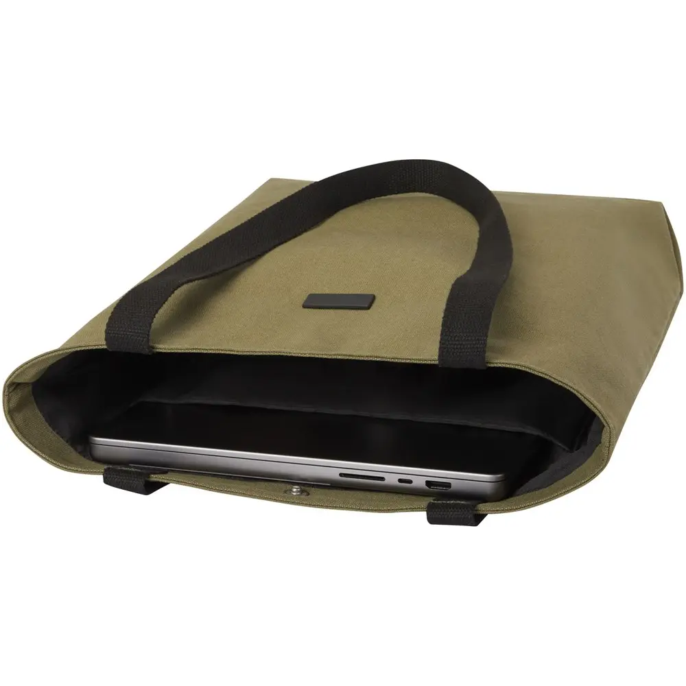 Profiteer van het gewatteerde vak voor een 15" laptop, twee binnenvakken voor telefoon of portemonnee, en een eenvoudige knoopsluiting voor veilig transport. De comfortabele katoenen handgrepen zorgen voor gemakkelijk dragen, terwijl het decoratieve metalen plaatje perfect is voor subtiele logobedrukking – ideaal om uw merk te versterken bij events of als reclame-uitreiking.