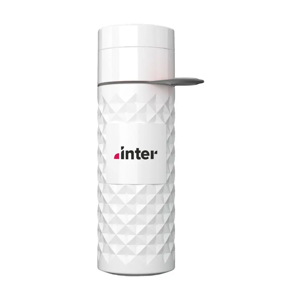 Het 3D diamantpatroon geeft de fles een elegante en professionele uitstraling, perfect voor events en marketingacties. Met twee openingen en schroefdoppen – een voor drinken en een royale voor eenvoudig schoonmaken of ijsblokjes toevoegen – biedt deze fles gebruiksgemak. De rubberen draaglus maakt hem eenvoudig mee te nemen, terwijl de lekvrije constructie en vaatwasserbestendigheid tot 65°C (handafwas aanbevolen voor opdrukbehoud) hem betrouwbaar maken voor dagelijks gebruik. Inhoud bedraagt 500 ml, met een diameter van 64 mm voor een comfortabele grip.