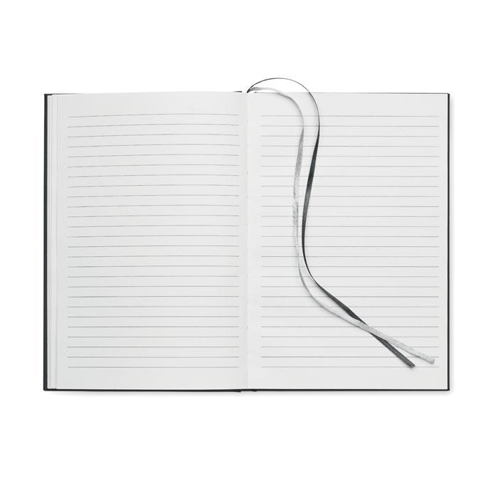 A5 journal notitieboek van 60% gerecycled post consumer polyester en 40% PU omslag. Gebonden. 256 gelinieerde pagina's van 70 grams gerecycled papier (128 vellen). Met 2 polyester bladwijzer linten.