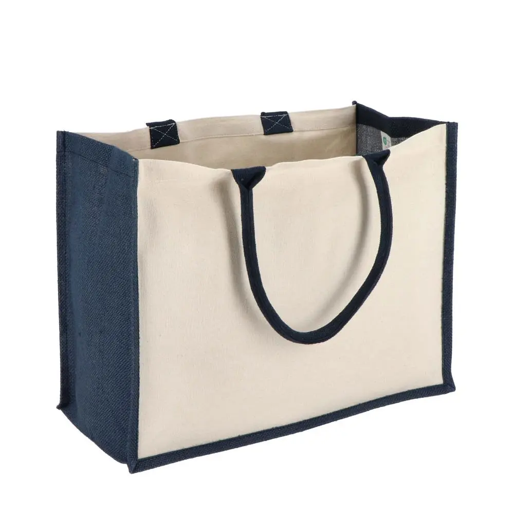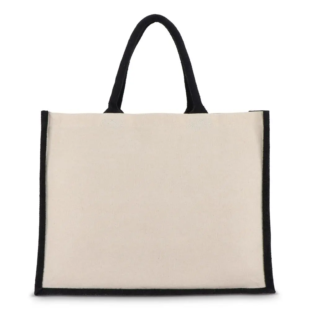 Ontdek onze stijlvolle tote tas met katoenen canvas voor- en achterpanelen en jute zijkanten en bodem, allemaal vervaardigd uit 320 gsm materiaal. De tas is afgewerkt met katoenen handvatten en accenten aan de zijkanten voor een aantrekkelijke uitstraling. Deze robuuste tas meet 42,5 x 19 x 32 cm en is ideaal als relatiegeschenk voor uw marketingcampagnes of events.