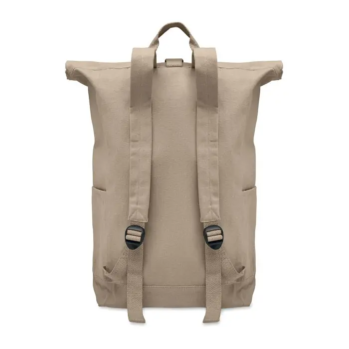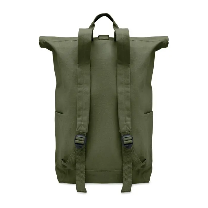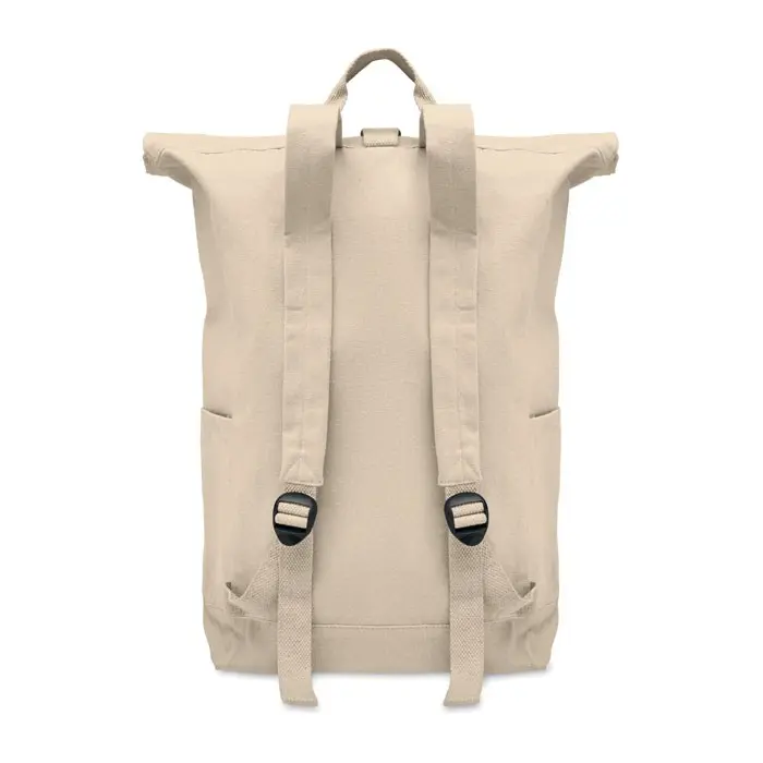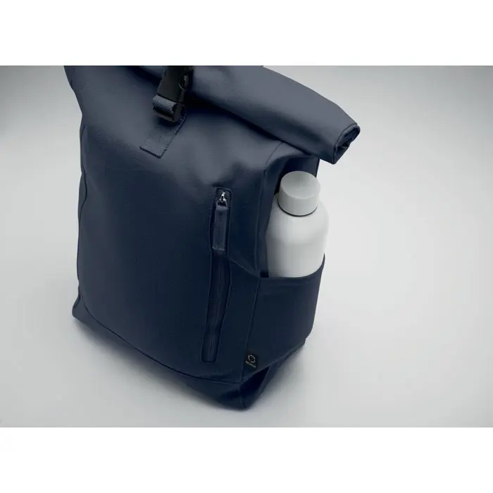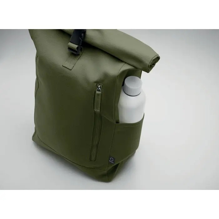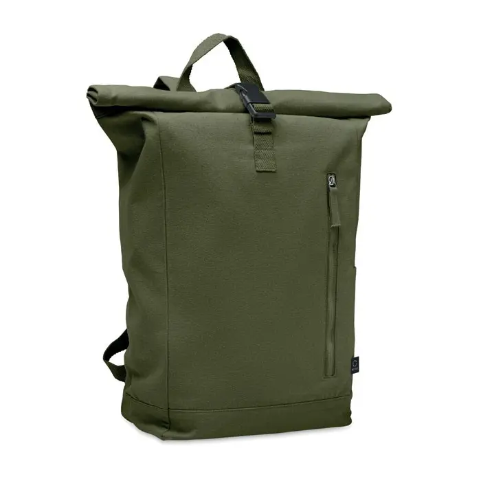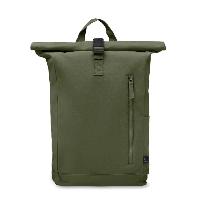 Ontdek onze rolltop rugzak, vervaardigd uit 390gr/m² gerecycled katoen (80%) en gerecycled polyester (20%). Deze robuuste tas biedt een klittenbandsluiting voor eenvoudige toegang en een voorvak met ritssluiting voor extra opbergruimte. Ideaal als gepersonaliseerd relatiegeschenk met uw logo, perfect voor marketingacties of events.