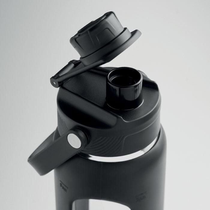 Hoge borosilicaatglasfles met siliconen doorzichtige hoes en PP dop met hengsel. Lekvrij. Inhoud: 750 ml.