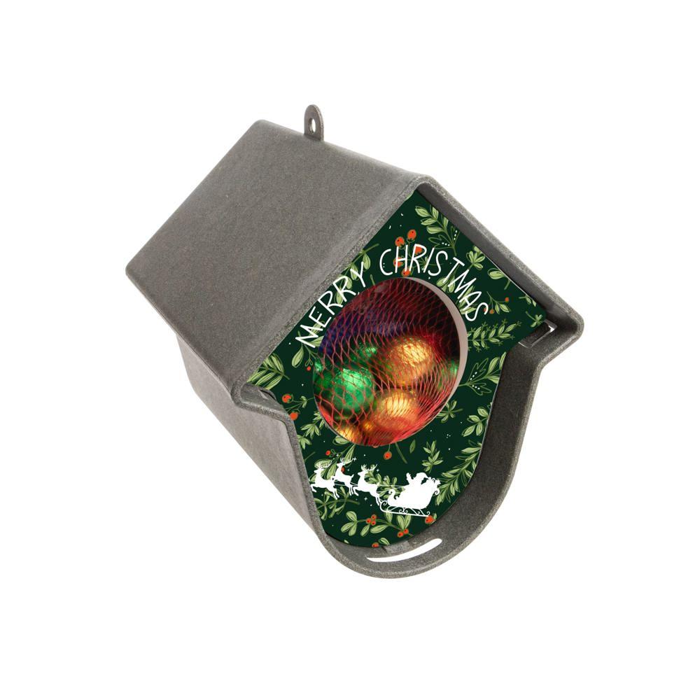 Het Kersthuisje Evie uit gerecycled materiaal verrast je klanten met 168 gram melkchocolade kerstballen met romige melkcrèmevulling. Personaliseer de voorzijde met je logo in full colour bedrukking voor een feestelijke touch die past bij je merk.