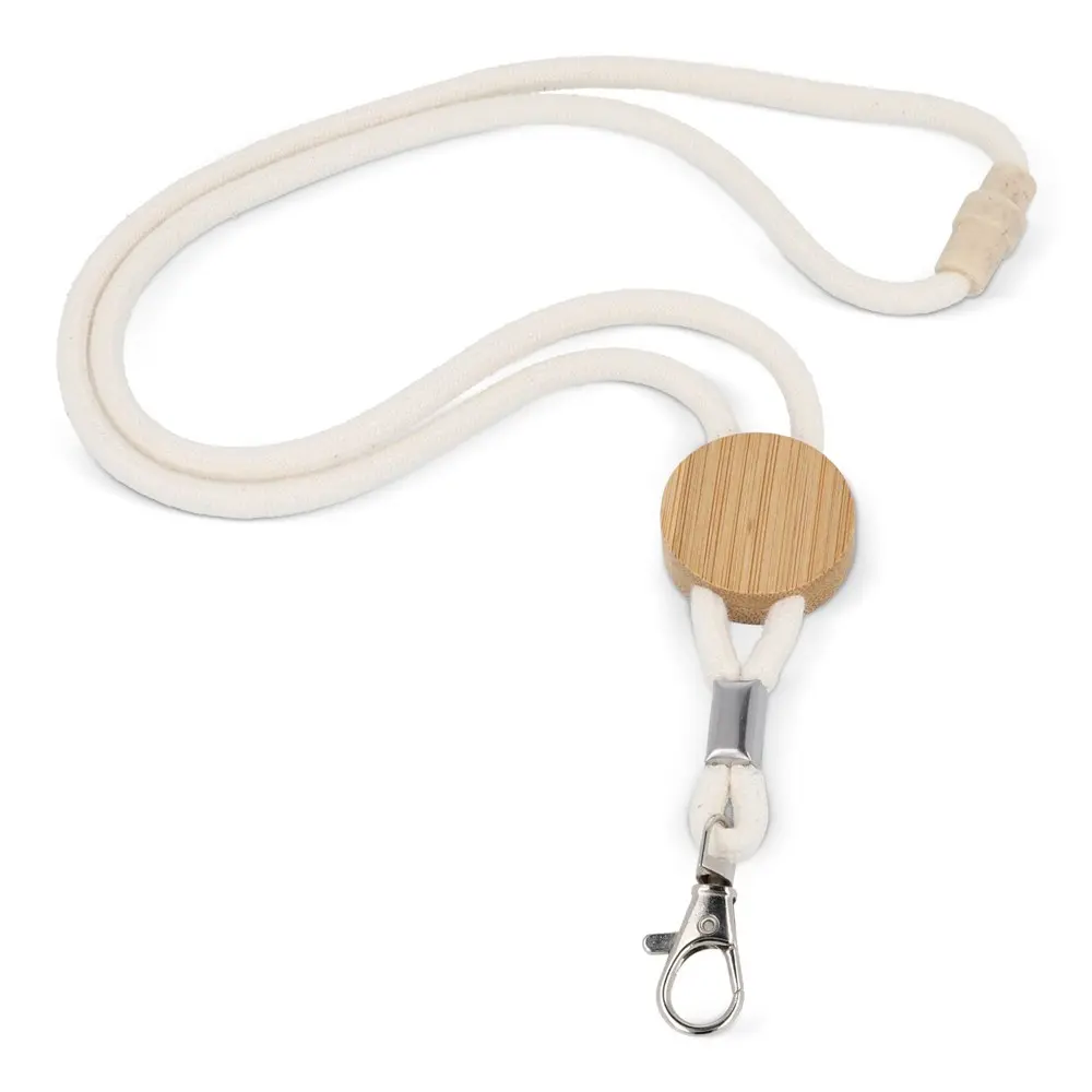 Deze lanyard bestaat uit een robuust katoenen koord dat biologisch afbreekbaar is, wat bijdraagt aan een milieuvriendelijke keuze voor uw bedrijf. De bamboe slider, gemaakt van hernieuwbare materialen, zorgt voor een natuurlijke uitstraling en duurzaamheid.
