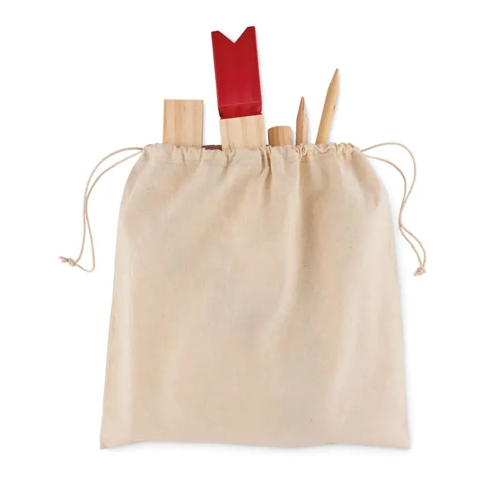 Dit authentieke houten werpspel, geïnspireerd op Zweedse tradities, biedt u een ideaal middel voor ontspannen teamactiviteiten en buitenpret. Gepresenteerd in een praktische katoenen trekkoordzak, is het spel eenvoudig op te bergen en mee te nemen naar uw events of promotionele bijeenkomsten.