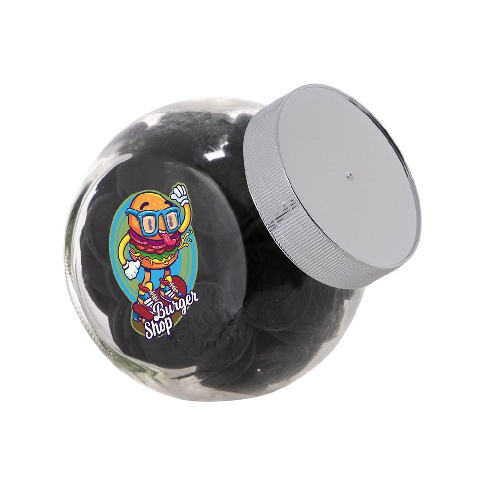 Klein glazen potje 0,4 liter met wit deksel, voorzien van een full colour sticker aan beide zijden en gevuld met Dropstaafjes mix