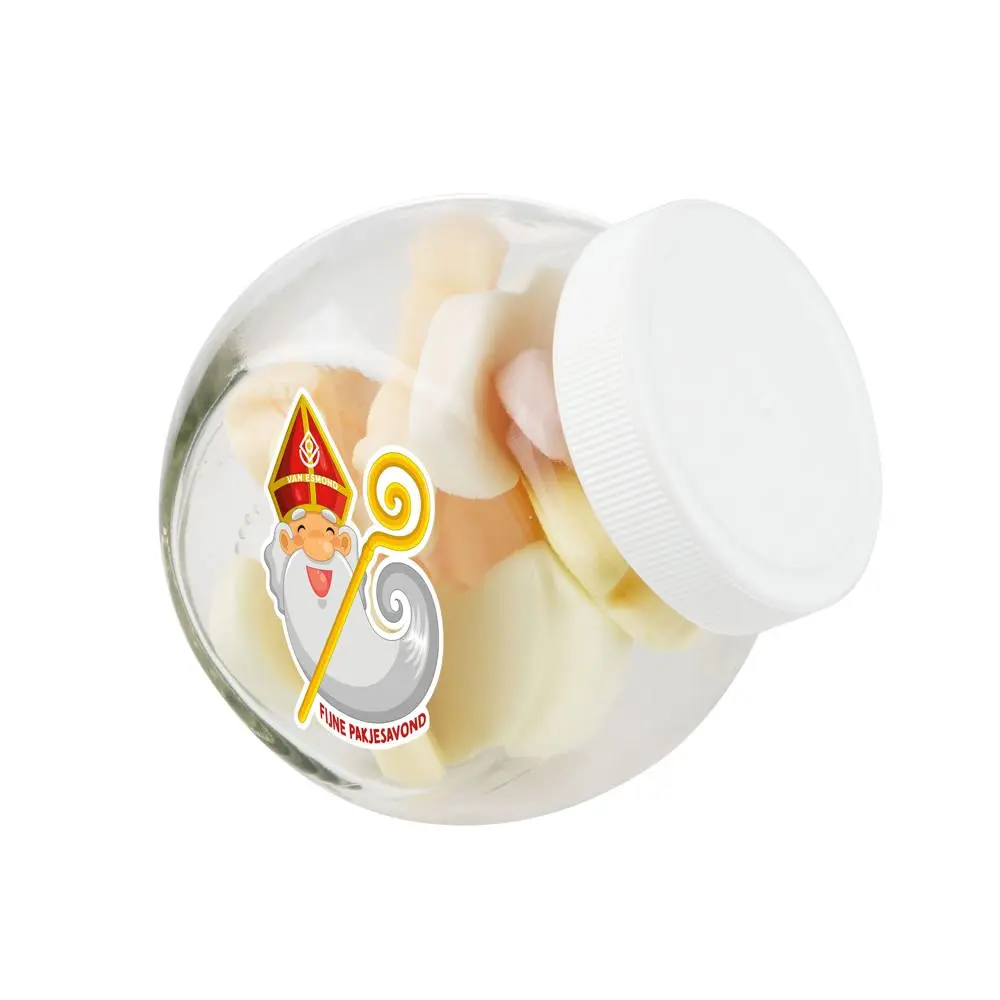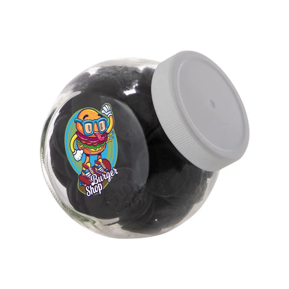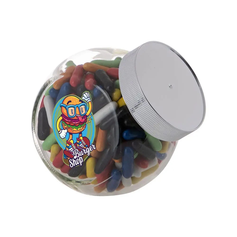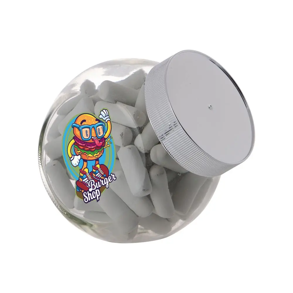 Dit compacte glazen potje van 0,4 liter is ideaal als relatiegeschenk voor uw onderneming. Het potje is gemaakt van stevig glas en gevuld met een smakelijke mix van dropstaafjes. U ontvangt het met een sticker op beide zijden, klaar voor uw eigen bedrukking met logo of boodschap. Perfect voor marketingacties of events, waar het een blijvende indruk nalaat bij uw klanten.