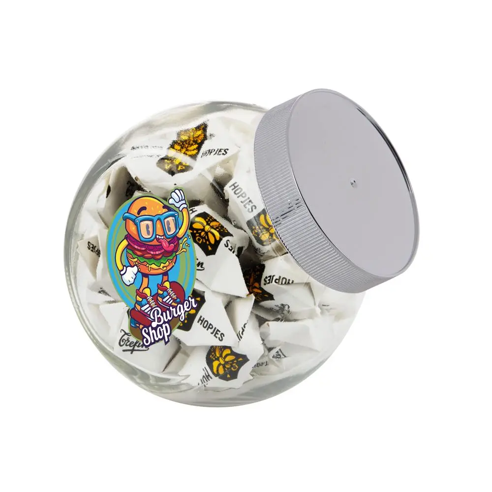 Ontdek ons kleine glazen potje van 0,4 liter, gevuld met een lekkere mix van dropstaafjes. Dit elegante relatiegeschenk is ideaal voor uw marketingacties of events, met de mogelijkheid tot personalisatie via full colour stickers aan beide zijden. Personaliseer het met uw logo om uw merk op een originele manier te promoten en een blijvende indruk na te laten bij uw klanten.
