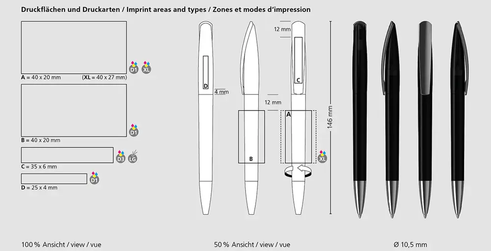 Met deze pen bereikt u een groot publiek tijdens events of als reclamegeschenk. De robuuste clip van verenstaal zorgt voor een stevige grip, terwijl de standaard vulling een schrijflengte van 3.000 meter garandeert voor langdurige zichtbaarheid van uw logo. Personaliseer de pen eenvoudig met uw bedrukking om een blijvende indruk na te laten bij uw klanten. Gemaakt in Europa, voldoet het product aan hoge kwaliteitsnormen en ondersteunt het uw duurzame bedrijfsimago.