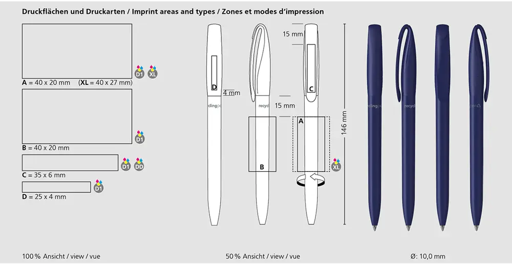 Met deze hoogwaardige, gerecyclede balpen versterkt u uw merk op een betaalbare en duurzame manier. Deel ze uit aan relaties om loyaliteit te bevorderen en uw engagement voor het milieu te benadrukken. Dankzij het strakke design en de betrouwbare functionaliteit wordt uw boodschap langdurig herinnerd.