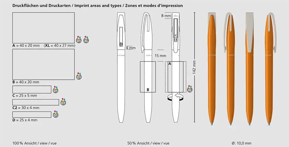 Met een lengte van 142 mm en een diameter van 10 mm biedt de Cobra bio een comfortabele grip en een professioneel uitzicht. De schacht, bovendeel en clip zijn hoogglanzend afgewerkt, perfect voor logobedrukking om uw merk zichtbaar te maken bij uw klanten.