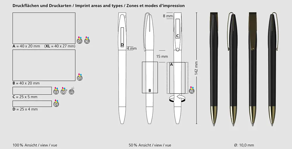 Met afmetingen van 142 mm lengte en 10 mm diameter ligt de pen comfortabel in de hand, perfect voor dagelijks gebruik door uw klanten. Personaliseer hem met uw logo voor optimale zichtbaarheid en merkpromotie. De standaardvulling schrijft soepel over 3000 meter, met opties voor extra functionaliteit zoals multifunctionele of gelvullingen.