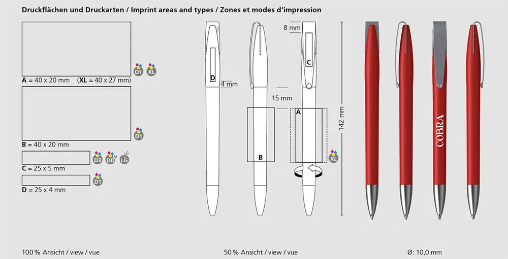 Personaliseer de pen met uw logo via bedrukking op de schacht of clip voor optimale zichtbaarheid bij uw klanten. De matverchroomde afwerking zorgt voor een duurzame, hoogwaardige look die langdurig indruk maakt. Gemaakt in Europa, voldoet de Cobra matt MMs aan strenge kwaliteitsnormen.