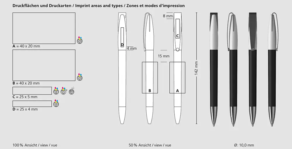 Personaliseer de pen eenvoudig met uw logo op de schacht of clip, wat uw zichtbaarheid versterkt tijdens events of als promotiemateriaal. De afmetingen van 142 mm lengte en 10 mm diameter zorgen voor een professionele uitstraling in grote oplages. Kies voor een standaard of optionele vulling voor langdurig, soepel schrijven – een slimme keuze om uw marketingstrategie te ondersteunen en relaties te versterken.