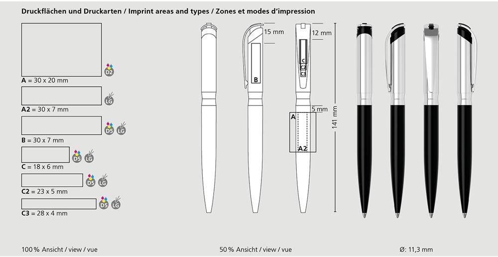 De I-roq metal Mc is een Draaibalpen. Materialen en oppervlakken: Schacht: Messing verchroomd, glanzend gelakt. Ring en bovendeel: Messing glansverchroomd. Clip: Verenstaal glansverchroomd. Standaard kleuren: Schacht: verkrijgbaar in 4-kleuren. : vanaf 10.000 stuks; vanaf 25.000 stuks zonder PMS-toeslag. Standaard vulling: Multifill P (8 000 m), blauw, vulling optioneel: Multifill P (zwart).