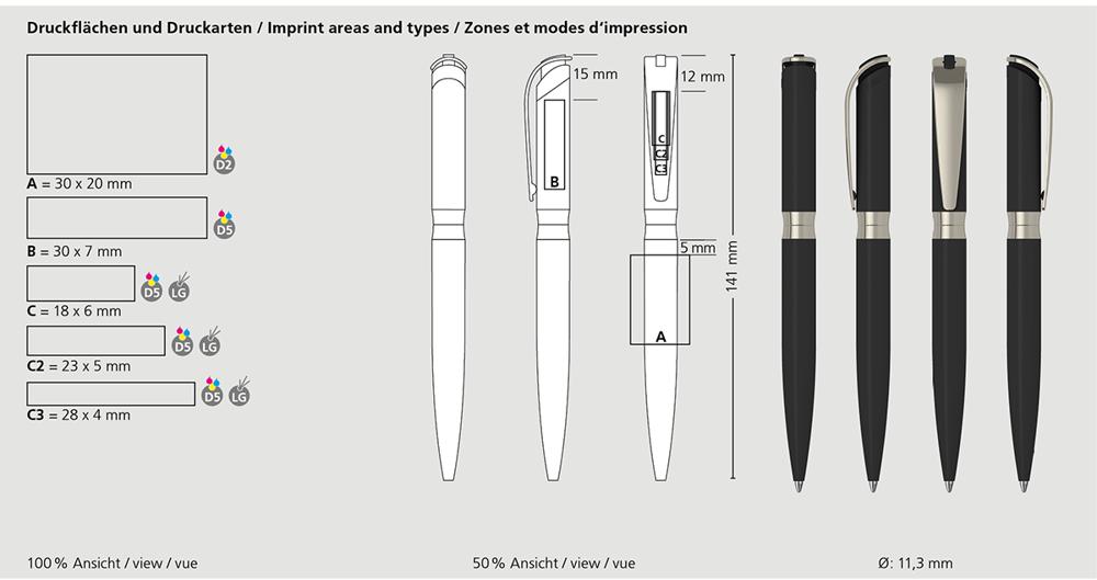 De I-roq softtouch Mb is een Draaibalpen. Materialen en oppervlakken: Schacht: Messing, met rubber softtouch oppervlak. Ring: Messing gepolijst. Bovendeel: Messing, met rubber softtouch oppervlak. Clip: Verenstaal gepolijst. Standaard kleuren: Schacht en bovendeel: zwart. : vanaf 10.000 stuks; vanaf 25.000 stuks zonder PMS-toeslag. Standaard vulling: Multifill P (8 000 m), blauw, vulling optioneel: Multifill P (zwart).