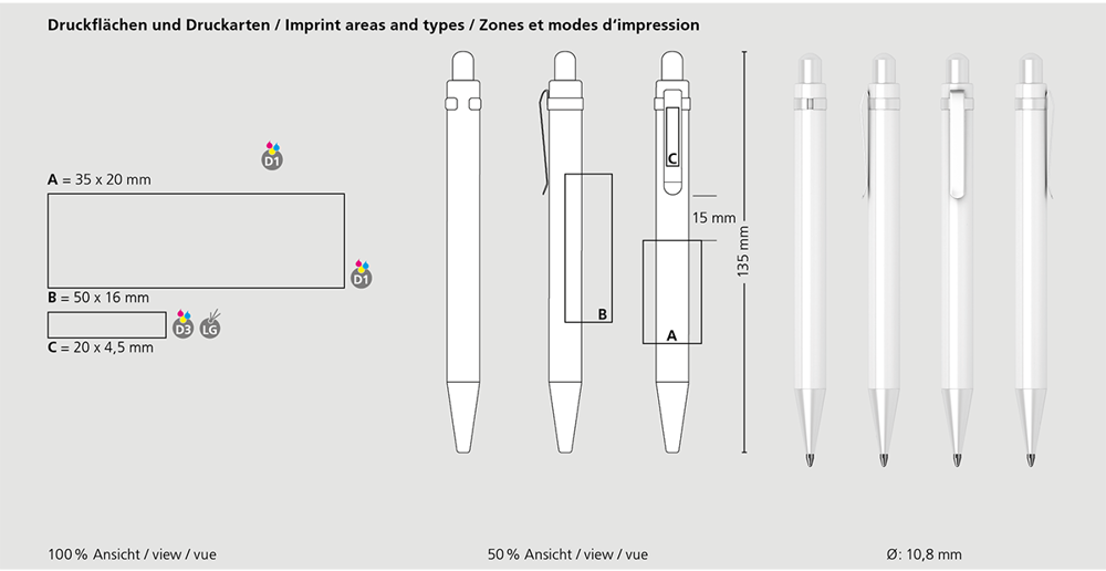 Met een lengte van 153 mm en een diameter van 10,8 mm ligt deze balpen comfortabel in de hand. De standaard vulling is een betrouwbare blauwe inkt met een schrijflengte van 2000 meter, optioneel uit te breiden met een zijdeachtige variant voor een soepel schrijfgevoel. Deze specificaties maken de pen geschikt voor dagelijks gebruik, of het nu gaat om notities tijdens een meeting of als giveaway op uw event.