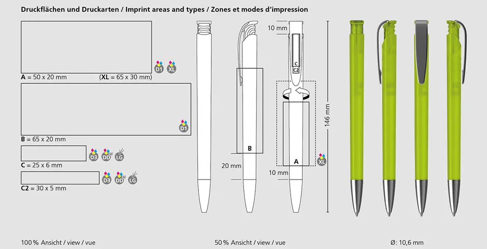 Met afmetingen van 146 mm lengte en een diameter van 10,6 mm ligt de pen comfortabel in de hand, perfect voor dagelijks gebruik. Personaliseer hem met uw logo via bedrukking, wat uw merkvisibiliteit versterkt tijdens events, beurzen of als promotiemateriaal. De betrouwbare vulling zorgt voor soepel schrijven over duizenden meters, wat de pen duurzaam en praktisch maakt.