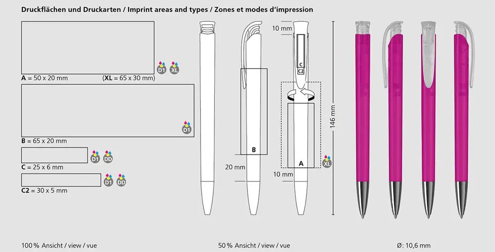 Personaliseer de schacht en clip met uw logo via drukknopbedrukking, vanaf kleine oplagen tot grote volumes, voor optimale zichtbaarheid op events of als promotie. De standaard vulling schrijft soepel over 3.000 meter, wat zorgt voor een betrouwbare indruk en langdurige waardering. Kies voor deze pen om uw merk te versterken en relaties op te bouwen met een kwalitatief geschenk dat stijl en functionaliteit combineert.