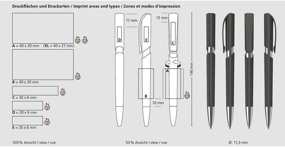 De Push high gloss Mn is een Drukknop-balpen. Materialen en oppervlakken: Punt: Messing vernikkeld. Schacht: Kunststof (ABS) hoogglanzend. Huls: Gemetaliseerd Drukknopclip: Kunststof (ABS) hoogglanzend. Navulbuis: Gerecycled polypropyleen (rPP). Standaard kleuren: Schacht en bovendeel: te combineren uit 14 kleuren. : vanaf 5000 stuks; vanaf 25.000 stuks zonder PMS-toeslag. Standaard vulling: Silktech L (3 000 m), blauw of zwart, vulling optioneel: Silktech XL, Multifill P, Multi-Gel.