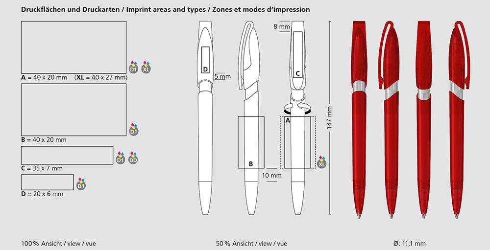 De Rodeo transparent is een Drukknop-balpen. Materialen en oppervlakken: Punt, schacht, huls, bovendeel en clip: Kunststof (M-ABS) transparant. Navulbuis: Gerecycled polypropyleen (rPP). Standaard kleuren: Punt, schacht, huls, bovendeel en clip: te combineren uit 12 kleuren. : vanaf 5000 stuks; vanaf 25.000 stuks zonder PMS-toeslag. Standaard vulling: Silktech L (3 000 m), blauw of zwart, vulling optioneel: Silktech XL, Multifill P, Multi-Gel.