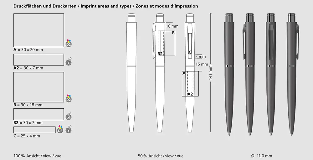 De slanke afmetingen van 141 mm lengte en 11 mm diameter zorgen voor een comfortabele grip en een luxueus gevoel. Gemaakt in Europa, staat deze balpen voor duurzaamheid en kwaliteit, perfect voor grootschalige personalisatie met uw logo.