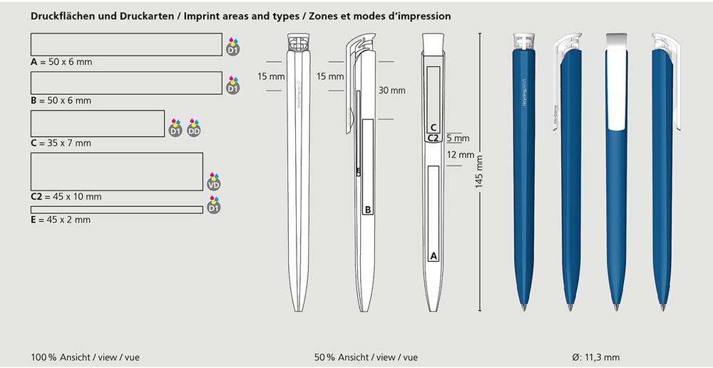 De Trias recycling is een Drukknop-balpen. Materialen en oppervlakken: Schacht en drukknopclip: Kunststof (rABS) hoogglanzend, gerecycled. Navulbuis: Gerecycled polypropyleen (rPP). Standaard kleuren: Schacht en drukknopclip: te combineren uit 14 kleuren. Opmerking: Doordat gebruik wordt gemaakt van gerecyclede grondstoffen, kunnen zelfs in afzonderlijke onderdelen van een product kleurafwijkingen voorkomen. : vanaf 3000 stuks; vanaf 25.000 stuks zonder PMS-toeslag. Standaard vulling: Silktech L (3 000 m), blauw of zwart, vulling optioneel: