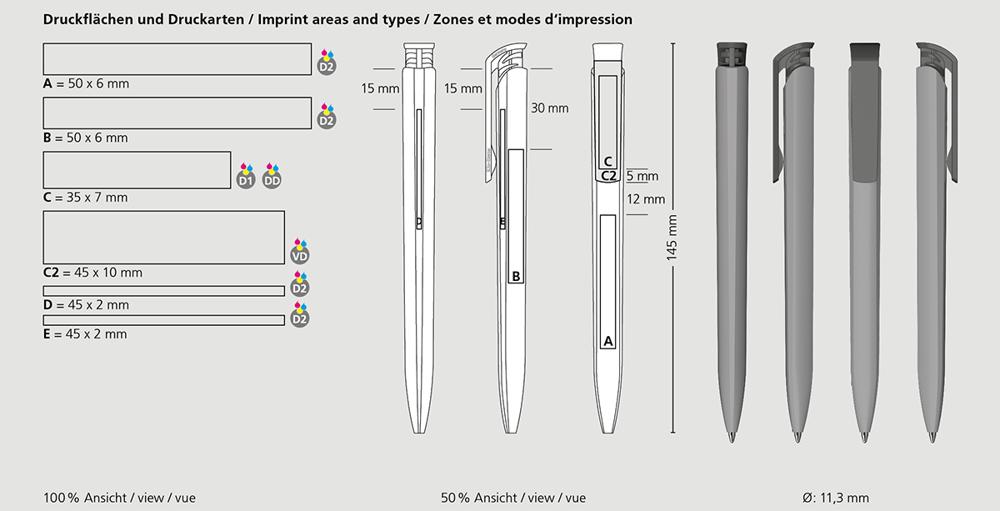 Ontdek deze stijlvolle drukknopbalpen met een comfortabel softtouch oppervlak op de schacht en een hoogglanzende drukknopclip. Gemaakt van stevig kunststof (ABS) en een navulbuis van gerecycled polypropyleen (rPP), wat hem duurzaam en milieuvriendelijk maakt. De vulling is een soepele Silktech L die tot 3000 meter schrijft, en je kunt kiezen uit blauw of zwart.