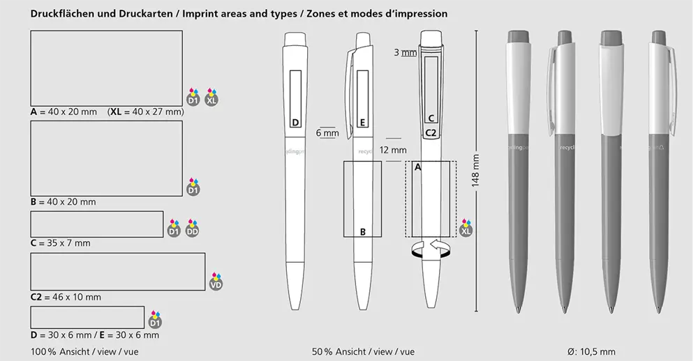 Door het gebruik van hoogglanzend rABS voor punt, schacht, bovendeel en drukknop, en rPOM voor het mechaniek, draagt uw keuze bij aan een duurzamere toekomst. Deze gerecyclede materialen verminderen afval en tonen uw engagement voor het milieu. Uw relaties zullen dit waarderen als een doordacht relatiegeschenk, terwijl het uw bedrijfsimago versterkt als innovatief en verantwoord.